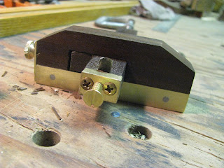 I have wanted to make a new marking gauge for a long time. My first one I built was sub-par. For my marking gauge #2, I wanted to fix the first's shortcomings. This is one thing that is very important in toolmaking. To know what you want to make, and how you don't want your tool to perform. The problem is that you probably won't get it totally right the first time. So what do you do? Do you buy more fancy materials, or do you just live with the tool that works, just not as well as it could? As a hobbyist, sometimes I can't justify making a new one. Prototypes sometimes help, sometimes not. Back to the marking gauge, my old gauge locked down securely, but the "blade" was a sawn-off nail that wouldn't stay in place, so the gauge didn't mark a clear line. Also, the body always seemed too shot to register well on the work. In the new gauge I fixed these problems.